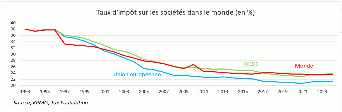 Les taux d'imposition des résultats des sociétés dans le monde ont très légèrement augmenté en 2024 et s'établissent désormais en moyenne à 23,51 % (23,37 % en 2023). C’est aussi le cas des pays de l'OCDE qui ont commencé à remonter leur taux depuis le plus bas atteint en 2022 (23,04 %) pour le porter à 23,85 % en 2024.