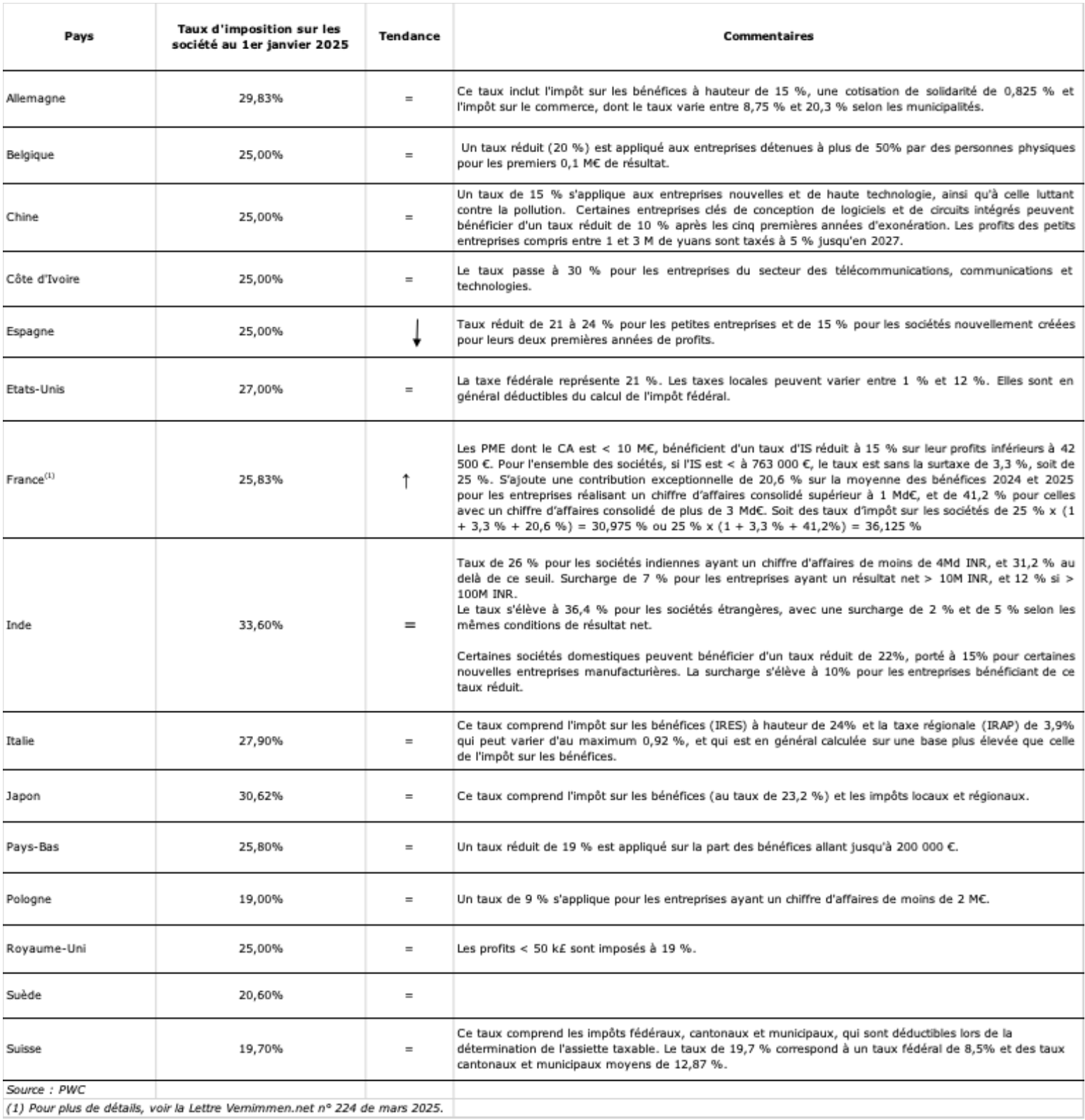 Tableau : Les taux d'impôt sur les sociétés dans le monde