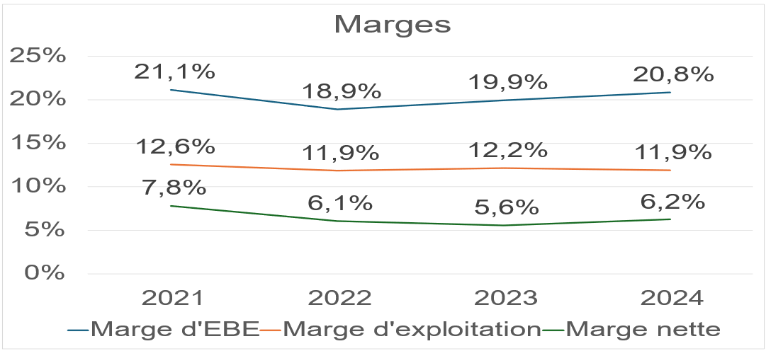 Espagne SA (nom que nous avons donné à l’agrégation des entreprises…) affiche une marge d’EBE d’environ 20 % et une marge d’exploitation d’environ 12 %, toutes deux relativement stables sur la période :