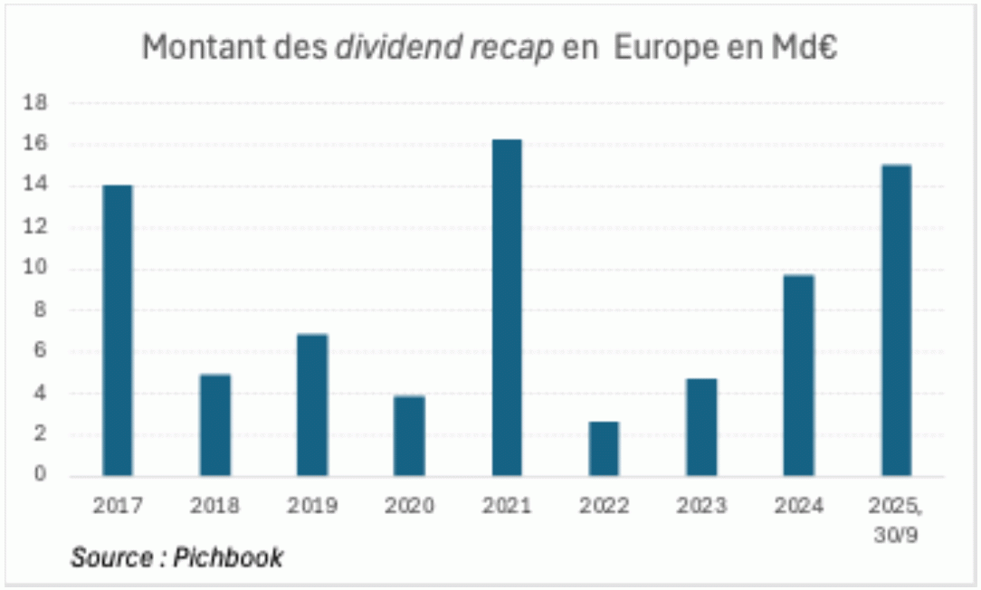 Ainsi Froneri dont nous avions parlé dans la rubrique commentaires de La Lettre Vernimmen d’octobre[1], a procédé à un dividend recap de 4,4 Md€, sous forme d’un dividende exceptionnel financé par une émission de dettes obligataires à haut rendement (4,75 % en € et 6 % en $ à échéance 2032). Cette opération ne contribue pas peu au montant de cette année qui a toutes ses chances de s’inscrire à un nouveau plus haut tant au niveau européen comme dans le graphique ci-après :
