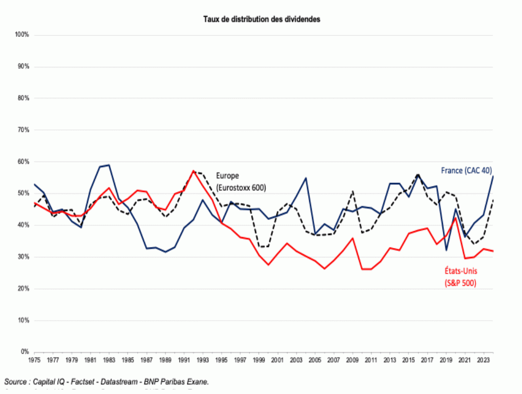 Je vous ai amené un graphique du Vernimmen[1] avec les taux de distribution des dividendes aux États-Unis, en Europe et en France depuis 1972 :